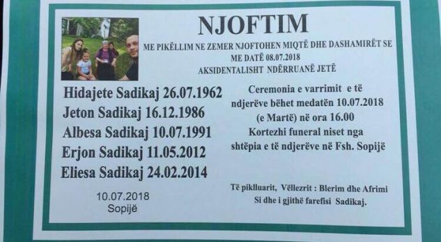 Njoftimin për varrimin e viktimave e kanë bërë familjarët e tyre përmes rrjeteve sociale.