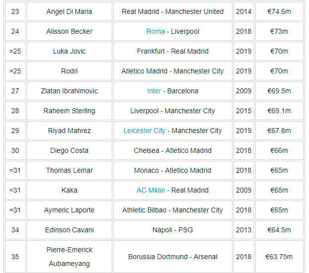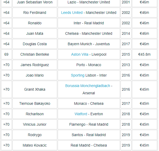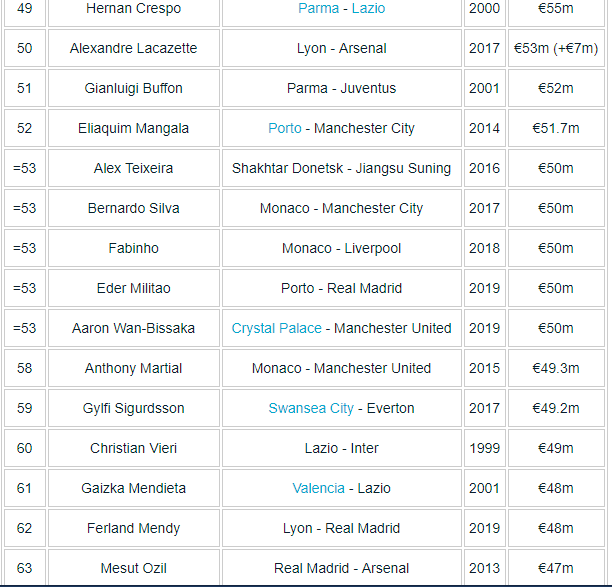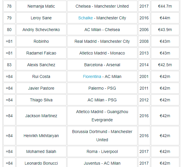 Në mesin e më të shtrenjtëve në histori është edhe Paul Pogba, që u transferua në “Old Trafford” në vitin 2016 nga Juventusi për 105 milionë euro, raporton Goal, transmeton Gazeta Express.