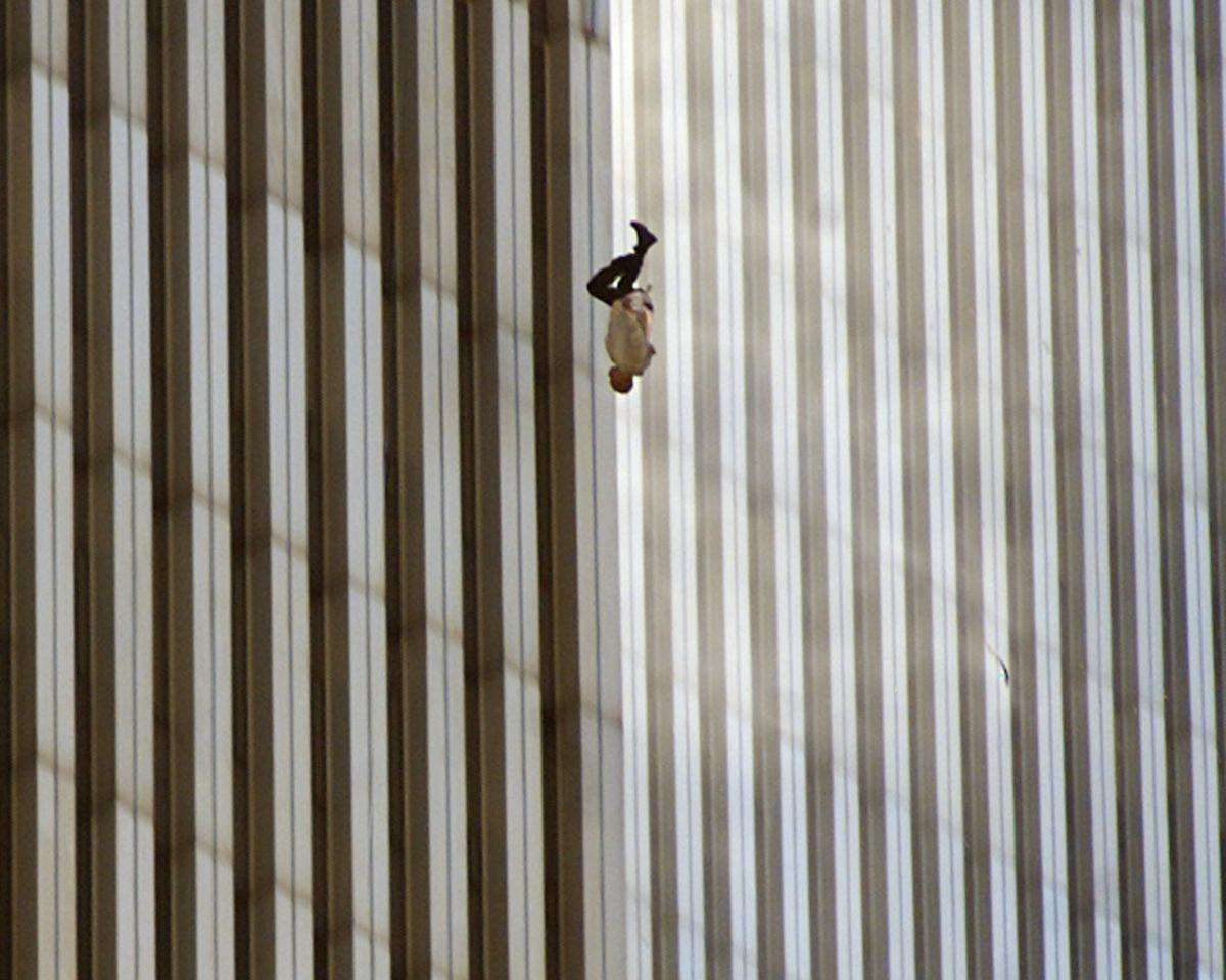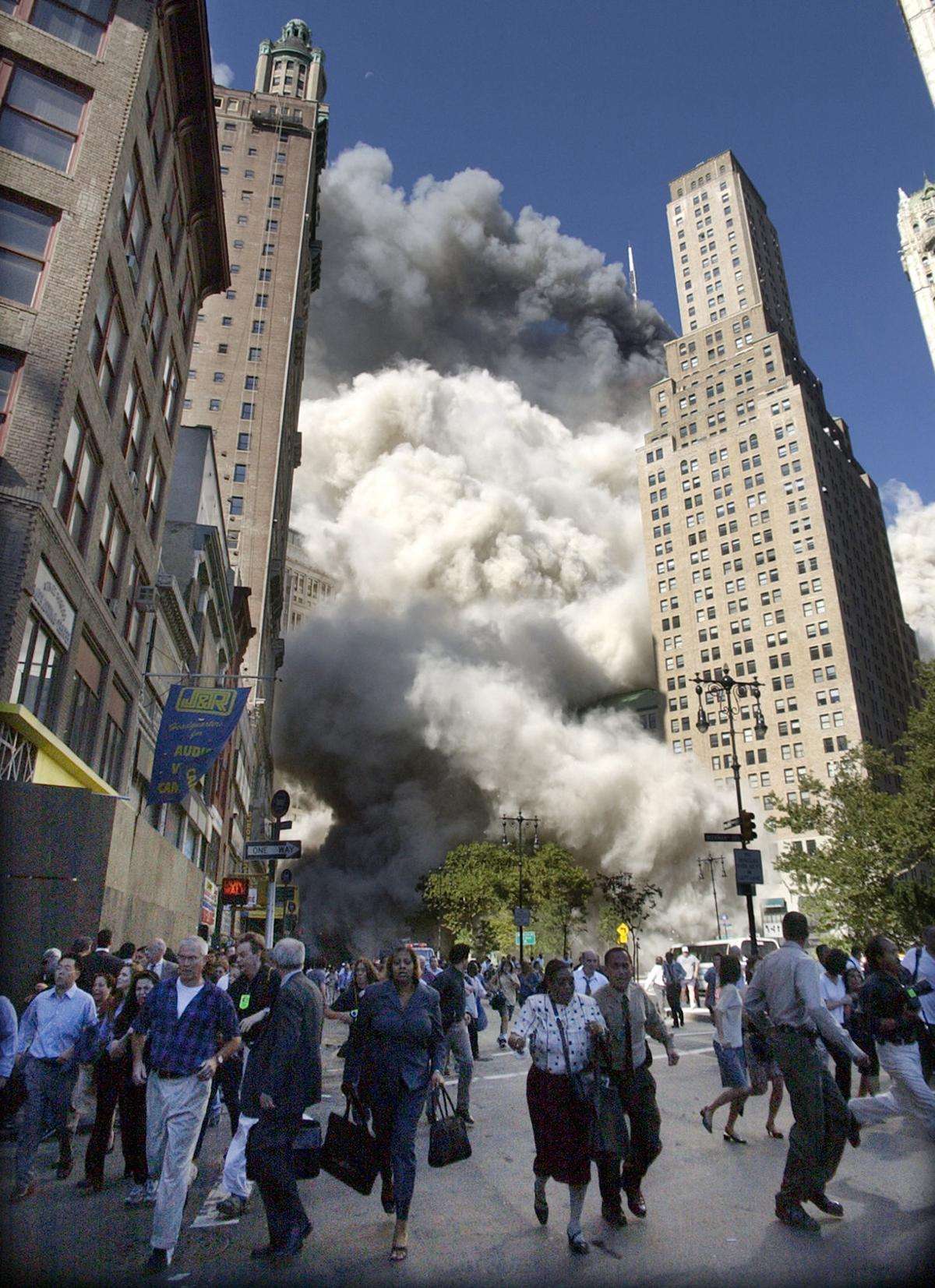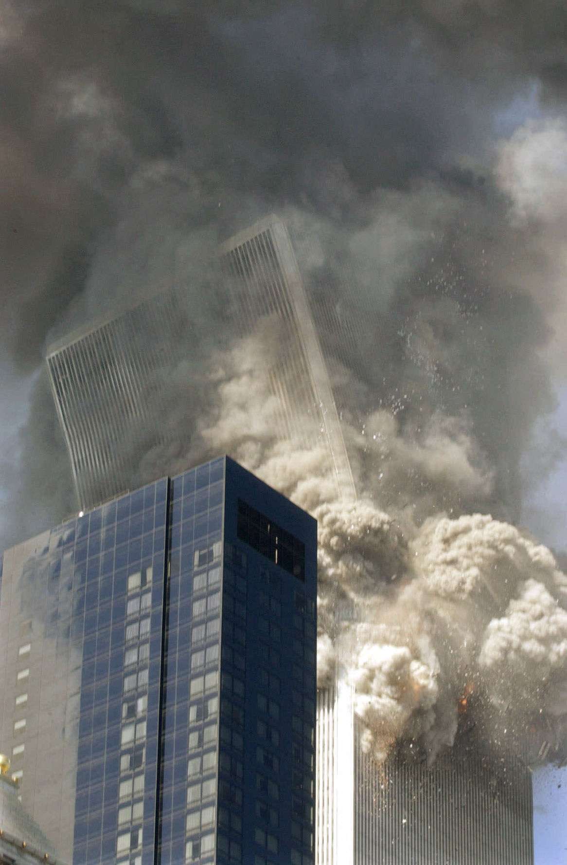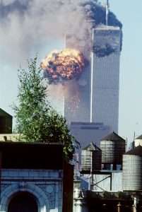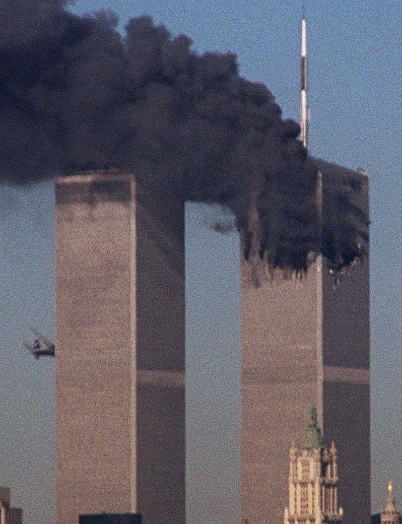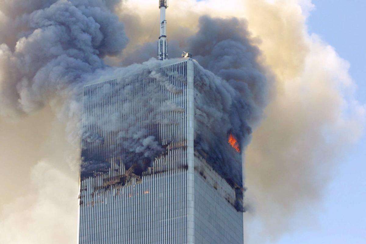Fillimisht njëri aeroplan i rrëmbyer ishte përplasur mbi kullën veriore të Qendrës Botërore të Tregtisë në Nju Jork, duke krijuar një çarje të thellë në faqen e ndërtesës dhe duke shkaktuar zjarr kurse 17 minuta më vonë, një aeroplan tjetër pasagjerësh përplaset mbi kullën jugore.