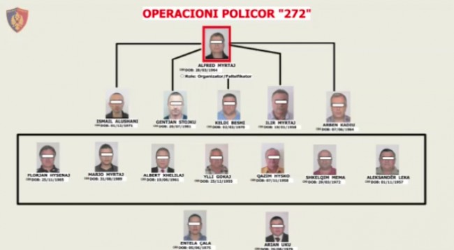 Të arrestuar janë Ilir Myrtaj, Alfred Myrtaj, Mario Myrtaj, Albert Xhelilaj, Gentian Stojku, Florjian Hysenaj, Entela Çala, punonjëse policie, Arjan Uku, punonjës policie, Kledi Beshi, Arben Kadiu, Ismail Alushani, Ylli Gokaj, Aleksandër Leka, Shkëlqim Mema, Qazim Hysko, Rizalba Hotaj, Vera Mehmetaj, gjithashtu u shpall në kërkim L. S., 26 vjeç nga Gjirokastra.