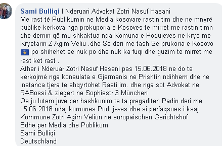 Sami Bulliqi nga fshati Llugë por me banim në Gjermani ka thënë se mos marrja e masave deri më tani nga organet kompetente ndaj komunës së Podujevës me në krye, Agim Veliun, e ka shtyrë atë të mendoj që Prokuroria e Kosovës nuk po ka guxim të merret me këtë rast.