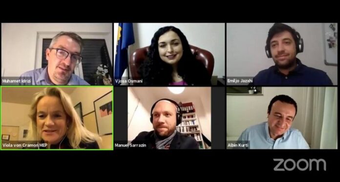 “Bashkë me Presidenten në detyrë, Znj. Vjosa Osmani, Raportuesen për Ballkanin Perëndimor në Parlamentin Evropian, Znj. Viola von Cramon dhe deputetin e të gjelbërve ne Bundestagun Gjerman, Z. Manuel Sarrazin, mbrëmë diskutuam për një orë e gjysmë në Zoom mbi situatën politike në Kosovë, vizionin reformator socio-ekonomik e ligjor të qeverisë sonë të ardhshme pas zgjedhjeve, agjendën tonë për nxjerrjen e shtetit nga kriza e shumëfishtë, si dhe integrimin evropian e rolin e diasporës.