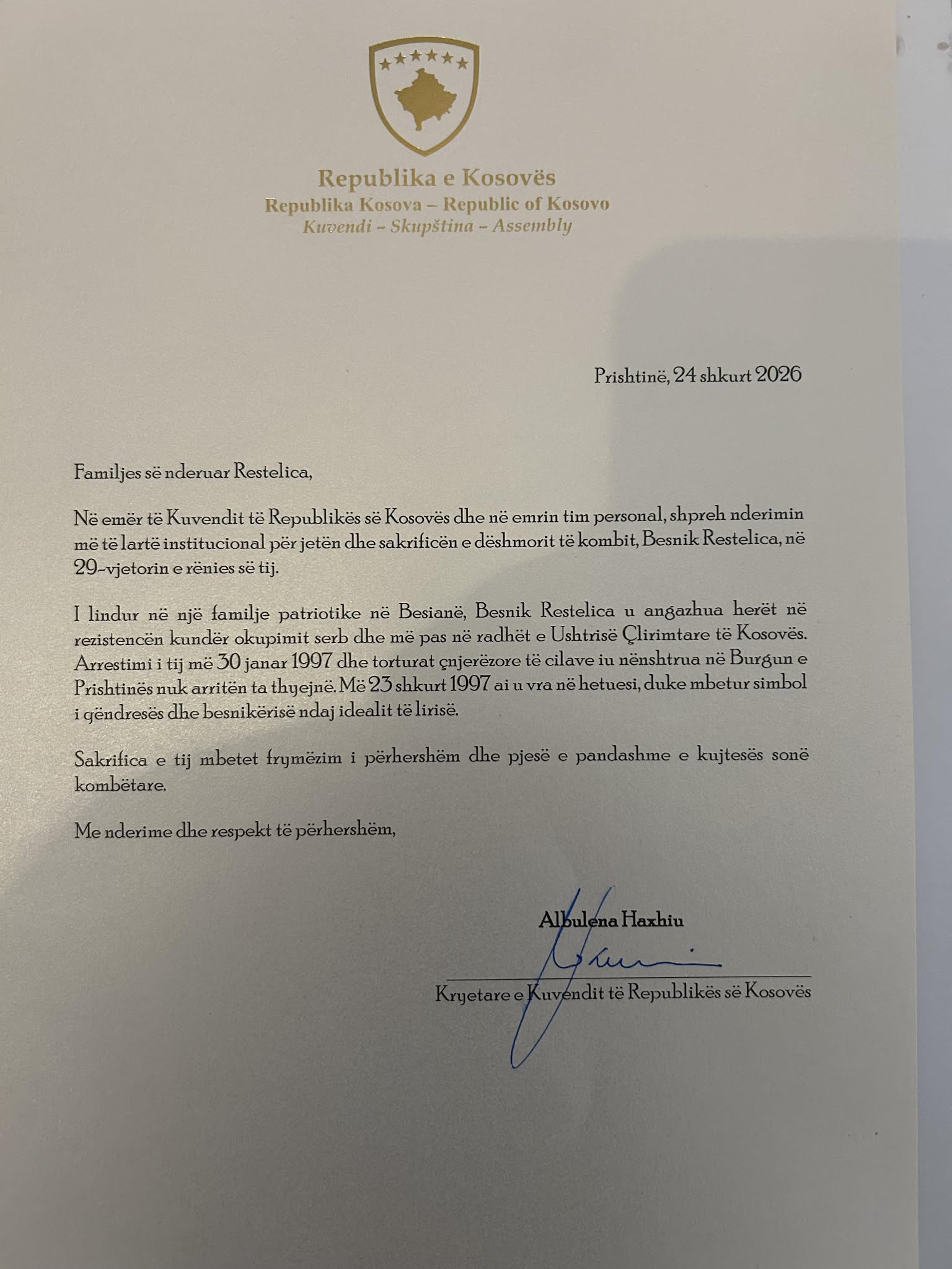Në emër të Kuvendit të Republikës së Kosovës dhe në emrin tim personal, shpreh nderimin më të lartë institucional për jetën dhe sakrificën e dëshmorit të kombit, Besnik Restelica, në 29-vjetorin e rënies së tij. I lindur në një familje patriotike në Besianë, Besnik Restelica u angazhua herët në rezistencën kundër okupimit serb dhe më pas në radhët e Ushtrisë Çlirimtare të Kosovës. Arrestimi i tij më 30 janar 1997 dhe torturat çnjerëzore të cilave iu nënshtrua në Burgun e Prishtinës nuk arritën ta thyejnë. Më 23 shkurt 1997 ai u vra në hetuesi, duke mbetur simbol i qëndresës dhe besnikërisë ndaj idealit të lirisë. Sakrifica e tij mbetet frymëzim i përhershëm dhe pjesë e pandashme e kujtesës sonë kombëtare. Me nderime dhe respekt të përhershëm, Albulena Haxhiu Kryetare e Kuvendit të Republikës së Kosovës”, thuhet në letrën e Haxhiut.