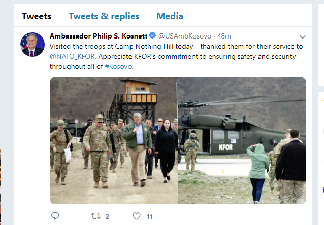 Përmes një postimi në Twittet, Kosnett ka thënë se e vlerëson lart angazhimin e KFOR-it për sigurinë në gjithë Kosovën.