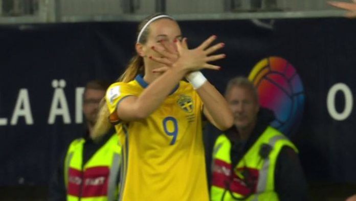 Kosovare Asllani, futbolliste me orgjinë shqiptare që luan për përfaqësuesen e Suedisë, zgjodhi këtë mënyrë festimi mbrëmë kur shënoi golin e 3-të për fitoren 3-0 përballë Ukrainës.
