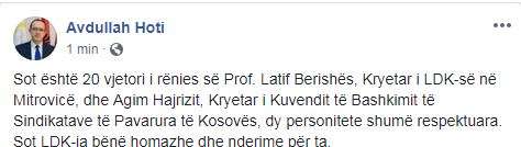 “Sot është 20 vjetori i rënies së Prof. Latif Berishës, Kryetar i LDK-së në Mitrovicë, dhe Agim Hajrizit, Kryetar i Kuvendit të Bashkimit të Sindikatave të Pavarura të Kosovës, dy personalitete shumë respektuara”.