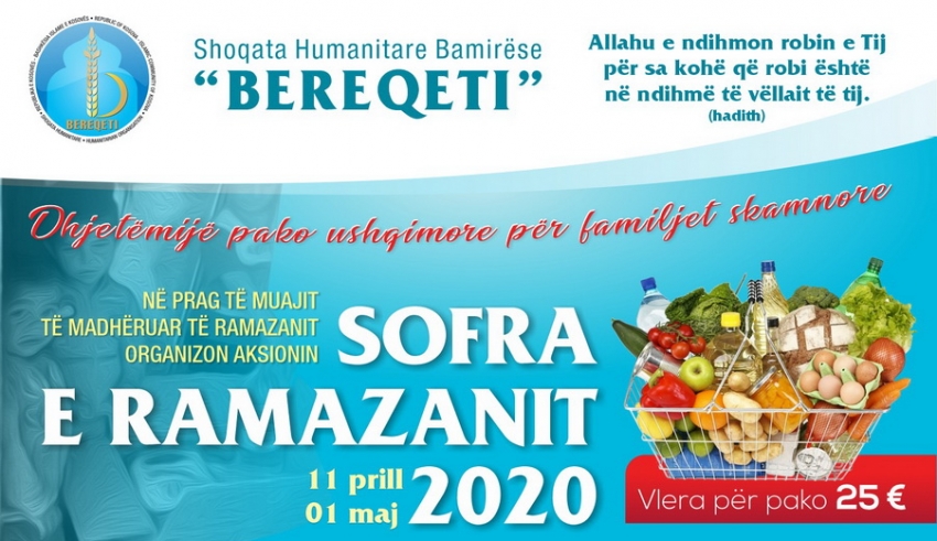 Në prag të muajit të Ramazanit, Shoqata Humanitare “Bereqeti” ka nisur aksionin “Sofra e Ramazanit 2020”, aksion ky që ka për qëllim ndihmën ndaj familjeve nevojtare.