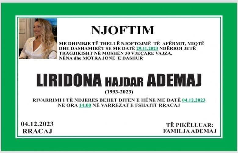 “Njoftim mortor nga familja Ademaj. Familja Ademaj njofton miq, shokë e dashamir se rivarrimi i vajzës tonë Liridona Ademaj e vrarë me datën 29.11.2023 bëhet nesër me datë 4 dhjetor 2023 në varrezat e fshatit Rracaj në ora 14:00”, thuhet në njoftim.