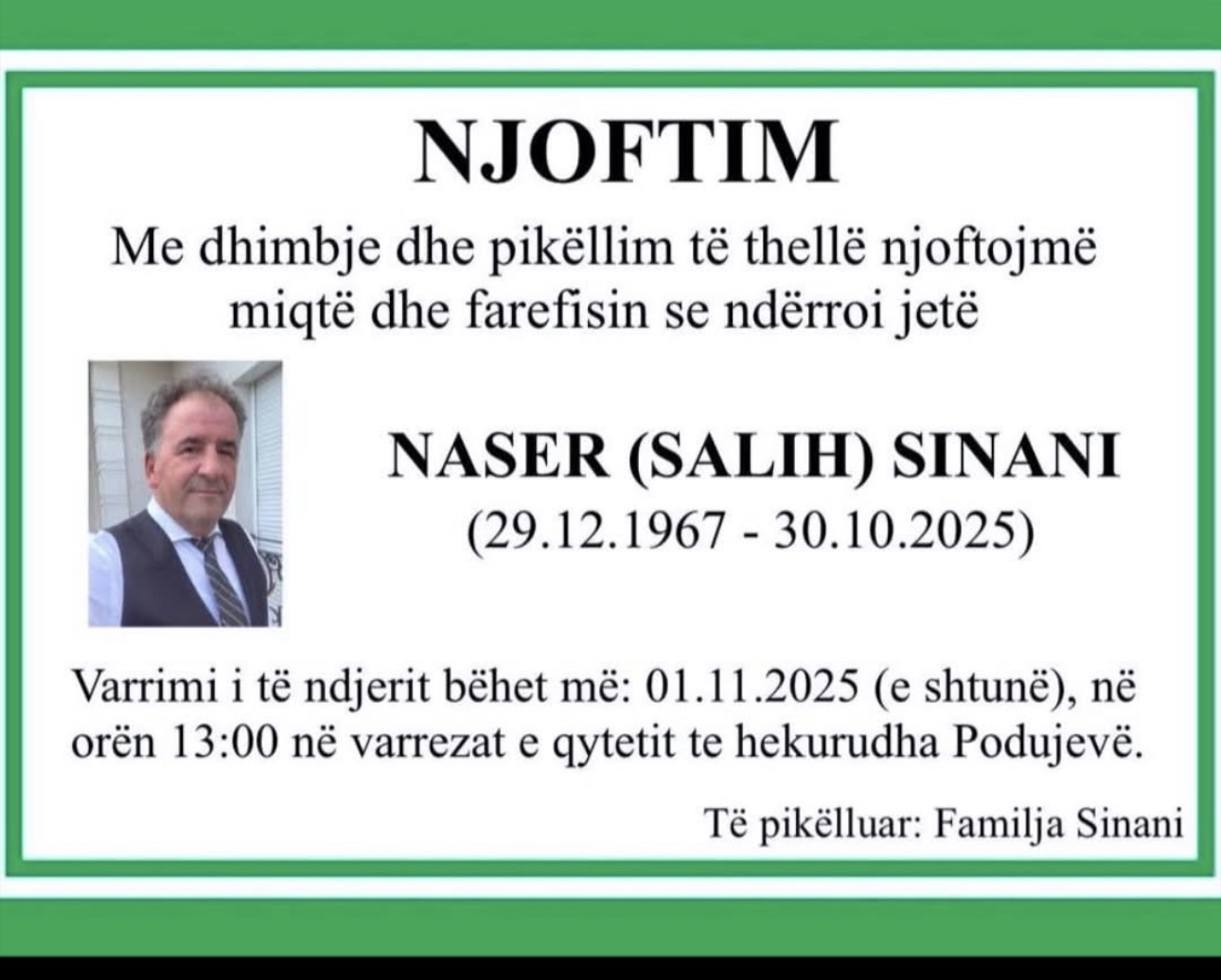 Ballina Lajmet Caktohet varrimi i mërgimtarit nga Podujeva (Foto) Caktohet varrimi i mërgimtarit nga Podujeva (Foto) 31/10/2025 Share FacebookTwitterWhatsAppViberEmail Është caktuar varrimi i Naser Sinanit nga Podujeva. Varrimi do të bëhet nesër në ora 13;00 në varrezat e qytetit – te Hekurudha. Lajmi u bë i ditur nga familjarët. Screenshot ARTIKUJ TË NGJASHËMMË SHUMË NGA AUTORI Lajmet Aksident i rëndë në Prishtinë mes tre veturave, ka të lënduar Lajmet Tronditje te Barcelona: Yamal diagnostifikohet me sëmundje të pashërueshme? Lajmet Ndërron jetë babai i Armend Mujës