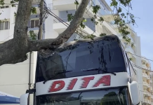 Një autobus me turistë në Vlorë është përplasur me një pemë, degët e së cilës janë zgjatur në rrugë.