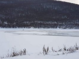 Ngiste biçikletën mbi liqenin e ngrirë në Çeki, thyhet akulli dhe bie në ujë