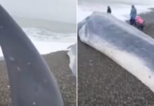 Stuhia e fuqishme nxjerr në plazh balenën 19 metërshe