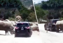 Rinoqeronti gjigant sulmon veturën familjare në Safari park