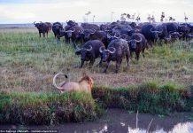 Një tufë buajsh kishin vendosur t’i hakmerren një luani të vetmuar, i cili më herët ua kishte mbytur një “pjesëtar” të tyre.