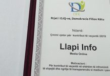 Rrjeti i OJQ-ve për rajonin e Llapit, “Demokracia Fillon Këtu”, sot ka ndarë çmimet vjetore për kontribut të veçantë për vitin 2019 në Komunën...