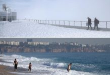 Turistët në Antalya shijojnë në të njëjtën ditë detin dhe borën