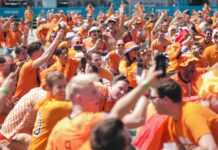 Tifozët e Holandës kanë arritur në rrugët e Budapestit, ku shihen se janë një numër i madh i tyre.