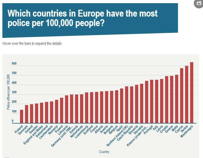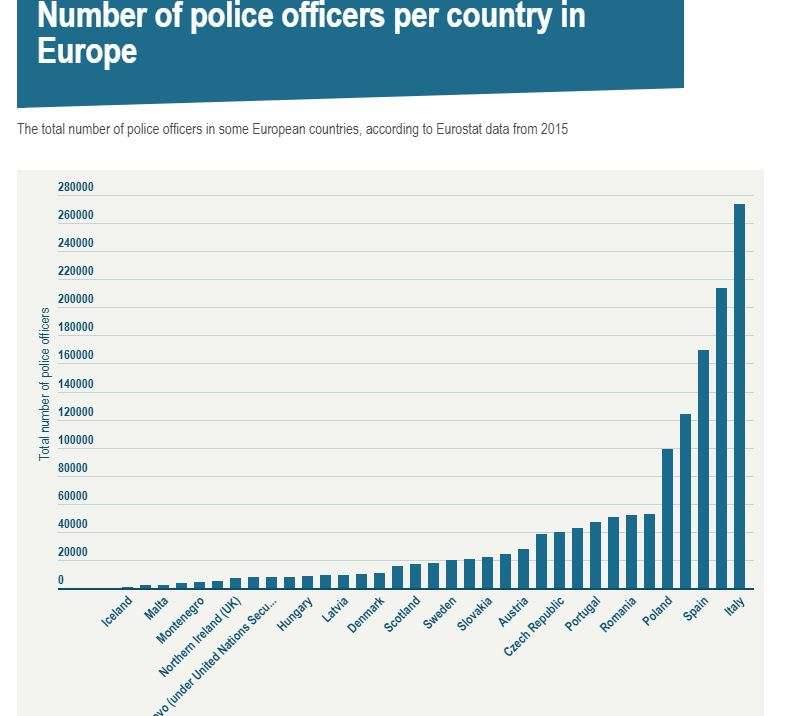 Shifrat, të marra nga statistikat zyrtare të prodhuara nga autoritetet në çdo vend, treguan se Hungaria kishte normën më të ulët të punonjësve të policisë me 90 për 100,000 njerëz në 2015. Raporti nuk përfshin shifra për të gjitha vendet e Evropës, vetëm ato që kanë dhënë të dhënat në Eurostat.