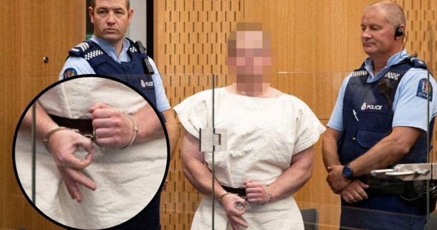 Ky sinjal me gishtërinj që përdori Tarrant siç edhe shihet në foto, përdoret nga grupe të famshme “të fuqisë së të bardhëve” anembanë botës, apo ndryshe njihet si përshtatje nga supermarcistët e bardhë.