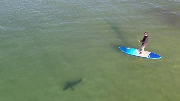 Një peshkaqen i madh i bardhë notoi frikshëm afër një bregu në Australi, vetëm disa metra larg peshkatarëve që qëndronin në ujërat e cekëta të detit.