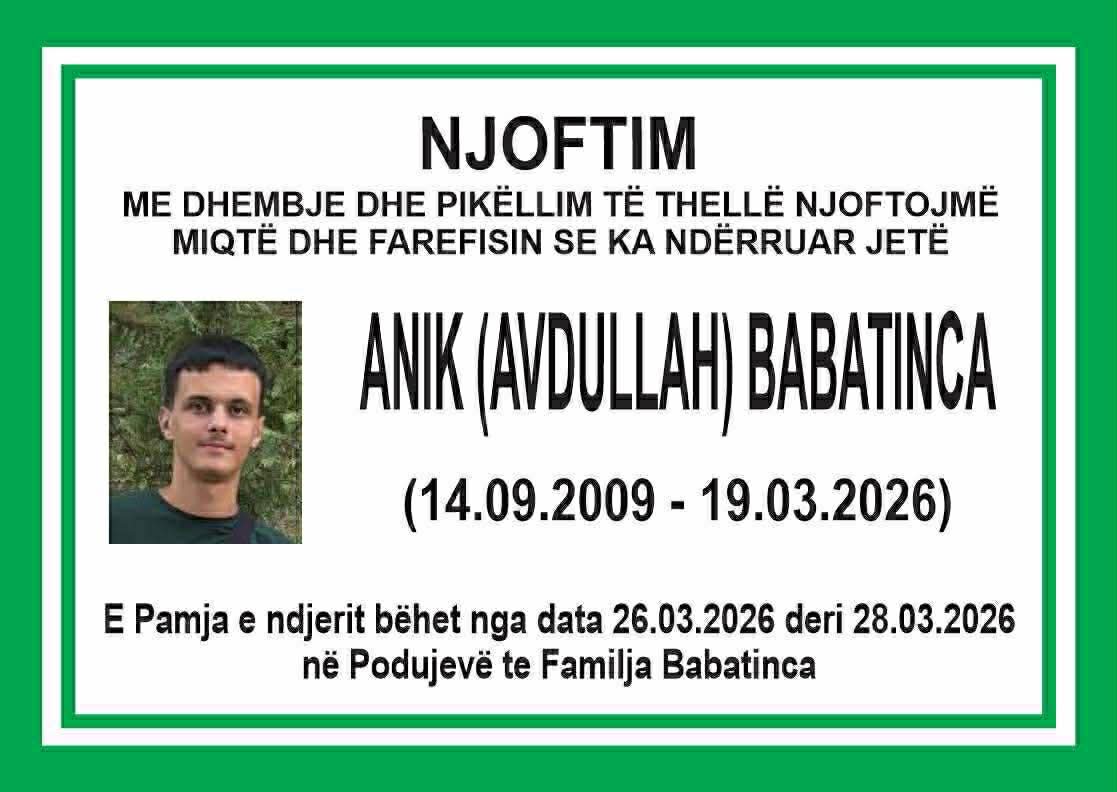 Ballina Lajmet Familja hap të pame për të riun nga Podujeva (Foto) Familja hap të pame për të riun nga Podujeva (Foto) 25/03/2026 Share FacebookTwitterWhatsAppViberEmail Familja Babatinca ka njoftuar se ka hapur të pame për të riun që ndërroi jetë ditë më parë, Anikun. E pamja do të mbahet nga data 26 deri më 28 mars. ARTIKUJ TË NGJASHËMMË SHUMË NGA AUTORI Lajmet Rikthehet lotaria amerikane, kriteret e reja të aplikimit për shqiptarët Lajmet Edhe një lajm i mirë për Podujevën (Foto) Lajmet Alarm në OKB: Sulmet iraniane rrezikojnë civilët në Gjirin Arabik