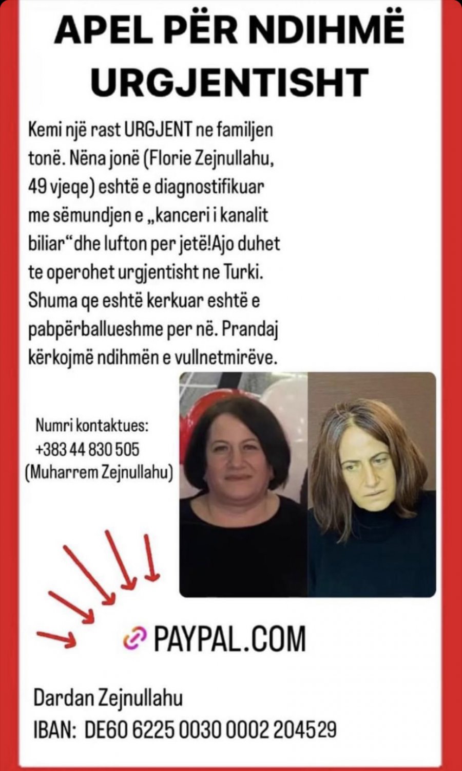 Sipas njoftimit të familjarëve, ajo vuan nga kanceri i kanalit biliar dhe i duhet urgjent operim në Turqi.