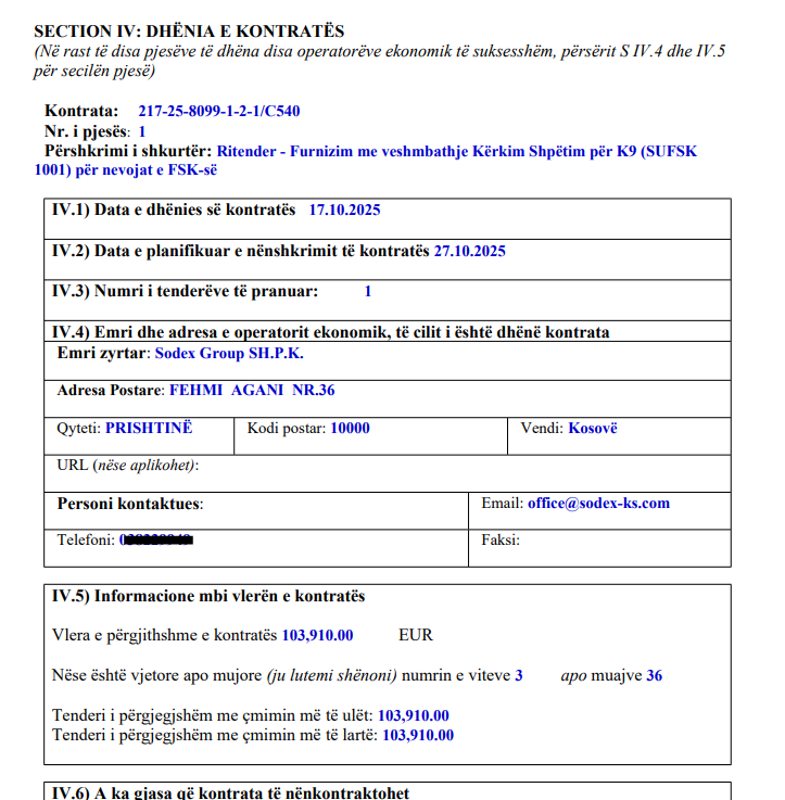 Sipas njoftimit zyrtar, kohëzgjatja e kontratës është paraparë të jetë 36 muaj, ndërsa furnizimi do të bëhet në përputhje me specifikimet teknike të përcaktuara në dosjen e tenderit.