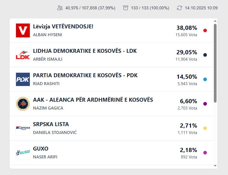 Sipas të dhënave të fundit të Komisionit Qendror të Zgjedhjeve, nga 113 kuti të numëruar Vetëvendosja radhitet e para me 38,08% (15,605 vota), pasuar nga LDK me 29,05% (11, 904 vota).
