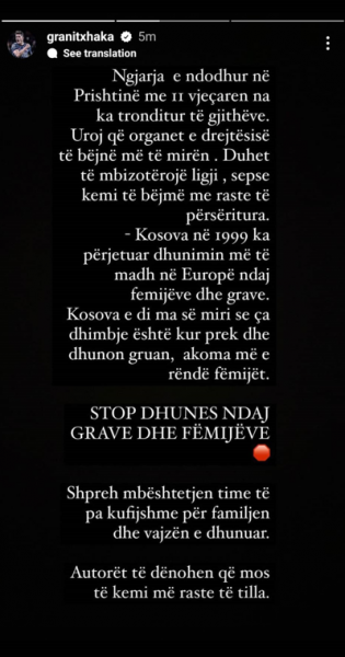 “Ngjarja e ndodhur në Prishtinë me 11-vjeçaren na ka tronditur të gjithëve. Uroj që organet e drejtësisëtë bëjnë më të mirë. Duhet të mbizotërojë ligji, sepse kemi të bëjmë me raste të përsëritura. Kosova në 1999 ka përjetuar dhunimin më të madh në Europë ndaj fëmijëve dhe grave. Kosova e di më së miri se çka është dhimbje është kur prek dhe dhunon gruan, akoma më e rëndë fëmijët”, shkroi Xhaka.