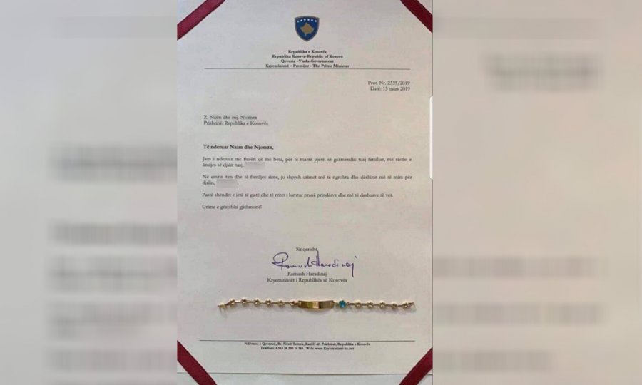 Së fundi, në emër të shtetit, me logo e me numër protokoli Haradinaj i ka bërë një urim dhe një dhuratë një çifti lindjen e djalit të tyre. Ua ka blerë edhe një dhuratë një byzylykë që duket të jetë prej ari, e ku ndodhet edhe një gur i kaltër, që ka simbolikën e gurit “kundër mësyshit”. Nga ana e pasme është shkruar emri i Haradinajt.