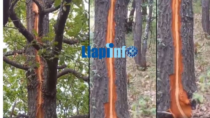 Në pamje shihet se si rrufeja ka kapur këtë lis nga maja e deri tek rrënjët.