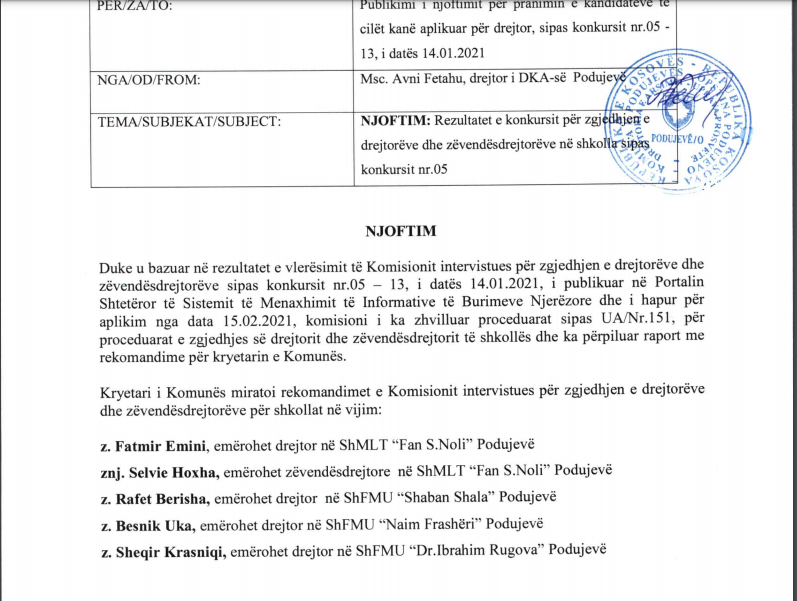 Emrat e rinj i ka bërë publikë edhe Komuna e Podujevës, ndërkohë që në njoftimin e dhënë bëhet e ditur se Kryetari i Komunës ka miratuar rekomandimet e Komisionit intervistues për përzgjedhjen e drejtorëve dhe zëvendësdrejtorëve për shkollat.