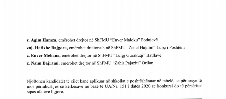 Përveç tyre, emrat e të emëruarve të tjerë nuk janë bërë publikë nga Komuna e Podujevës deri më tani, pasi konkursi për drejtor do të përsëritet në 32 shkolla.