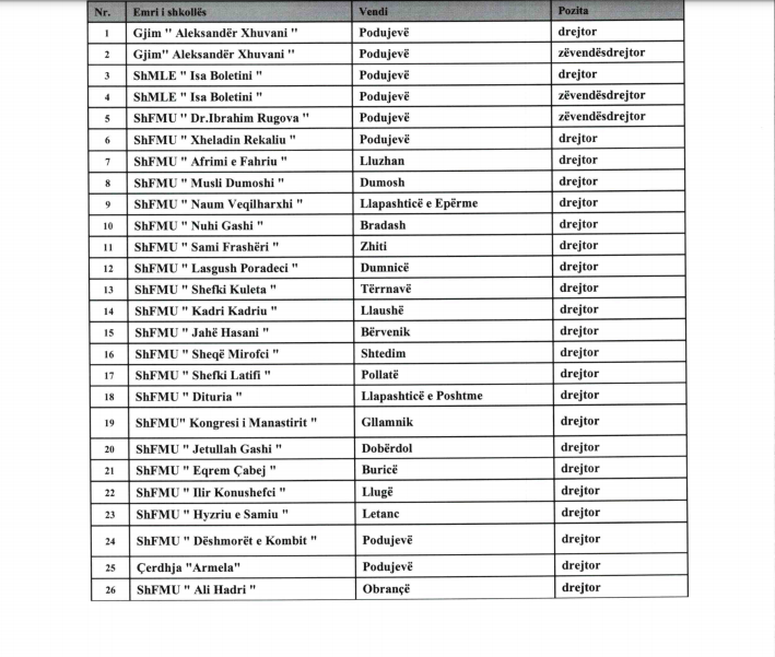 Rafet Berisha është zgjedhur drejtor i Shkollës Fillore “Shaban Shala”. Besnik Uka është zgjedhur drejtor i Shkollës Fillore “Naim Frashëri”. Sheqir Krasniqi është emëruar drejtor i Shkollës Fillore “Ibrahim Rugova”. Agim Hamza është emëruar drejtor i shkollës Fillore “Enver Maloku”. Hatixhe Bajgora është emëruar drejtoreshë e Shkollës Fillore “Zenel Hajdni” në Lupc të Poshtëm. Enver Mehana është emëruar drejtor në Shkollën Fillore “Luigj Gurakuqi” në Batllavë dhe Naim Bajrami është emëruar drejtor drejtor në Shkollën Fillore “Zahir Pajaziti” në Orllan.