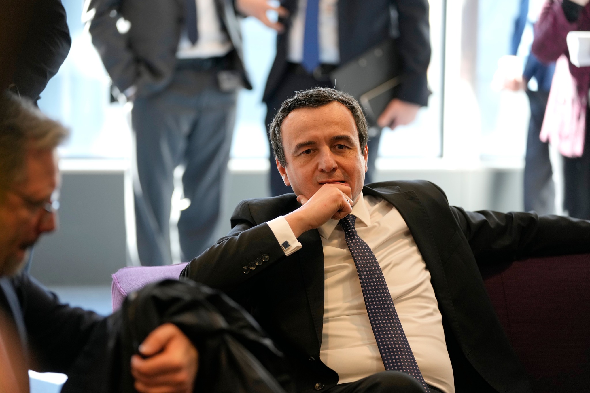 Kosovo's Prime Minister Albin Kurti, center, waits prior to a meeting with European Union foreign policy chief Josep Borrell in Brussels, Monday, Feb. 27, 2023. The leaders of Serbia and Kosovo are holding talks Monday on European Union proposals aimed at ending a long series of political crises and setting the two on the path to better relations and ultimately mutual recognition. (AP Photo/Virginia Mayo)