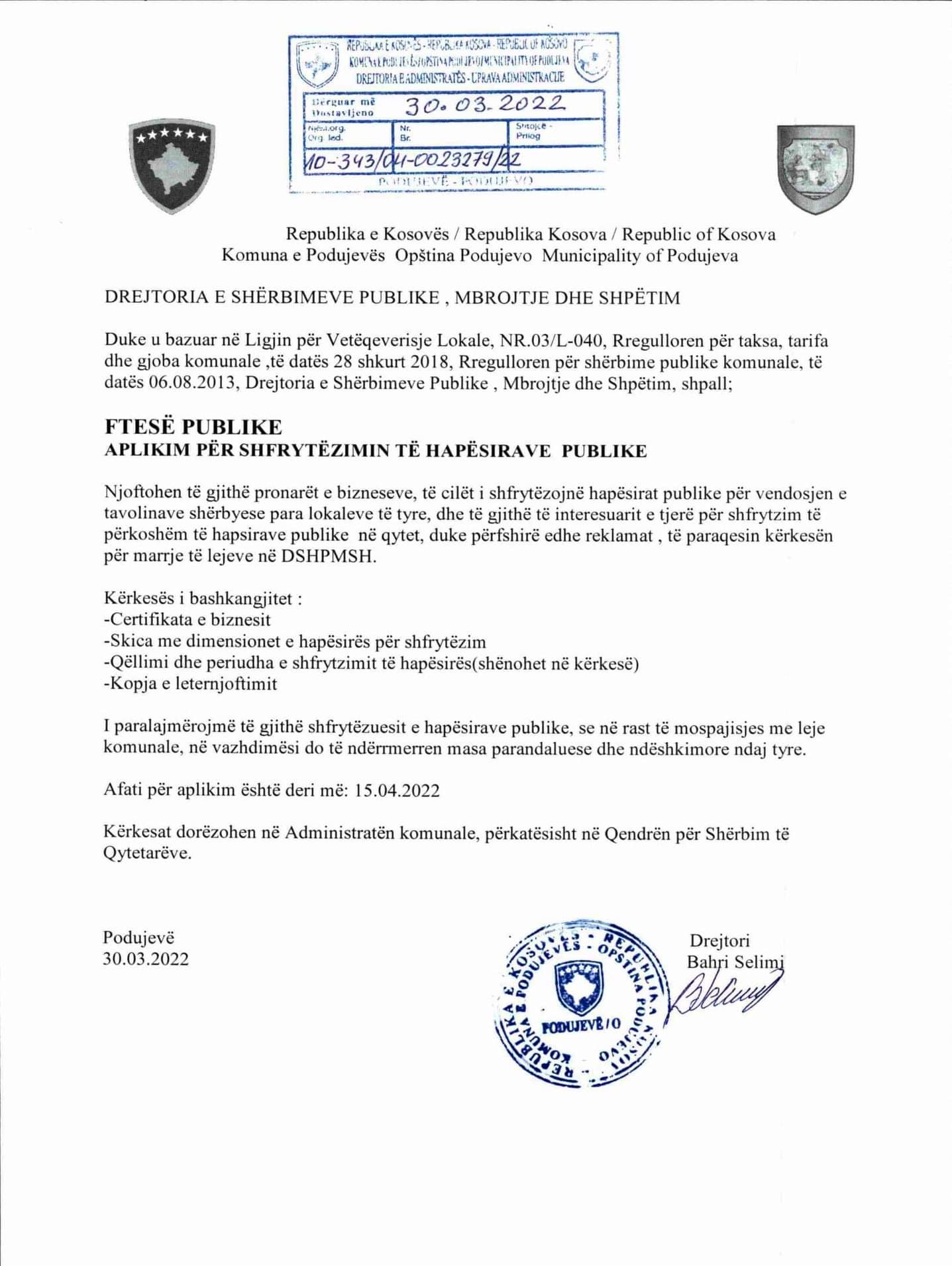 Bizneset të cilat dëshirojnë t’i shfrytëzojnë hapësirat publike për vendosje të tavolinave dhe karrigeve ose personat tjerë që dëshirojnë që t’i vendosin reklamat në hapësirat publike, të aplikojnë deri më datën: 15.04.2022.