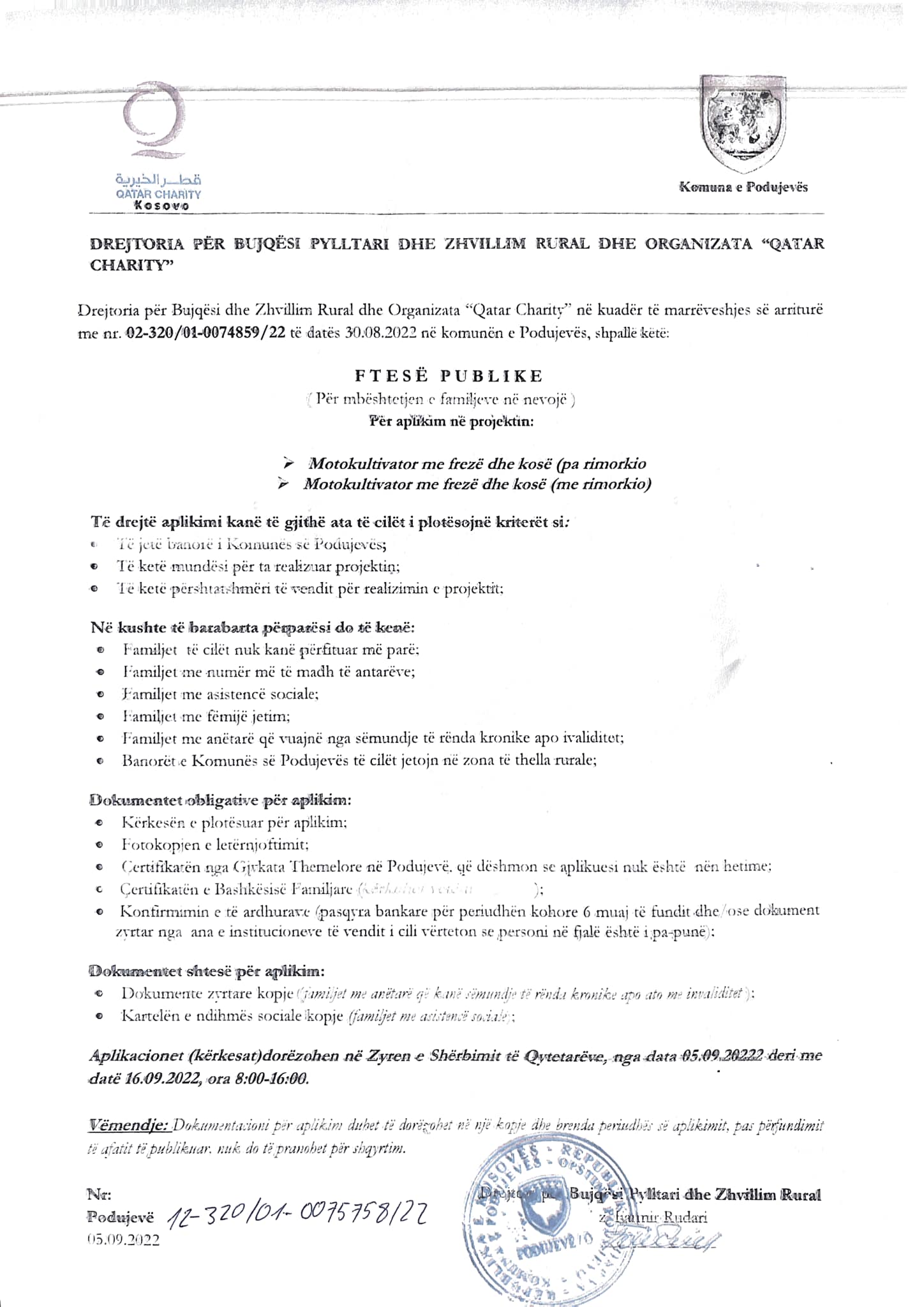 Drejtoria e Bujqësisë në komunën e Podujevës dhe organizata “Qatar Charity”, ka shpallur konkurs për fermerët që të aplikojnë për t’u pajisur me motokultivatorë, shkruan Llapi.info.