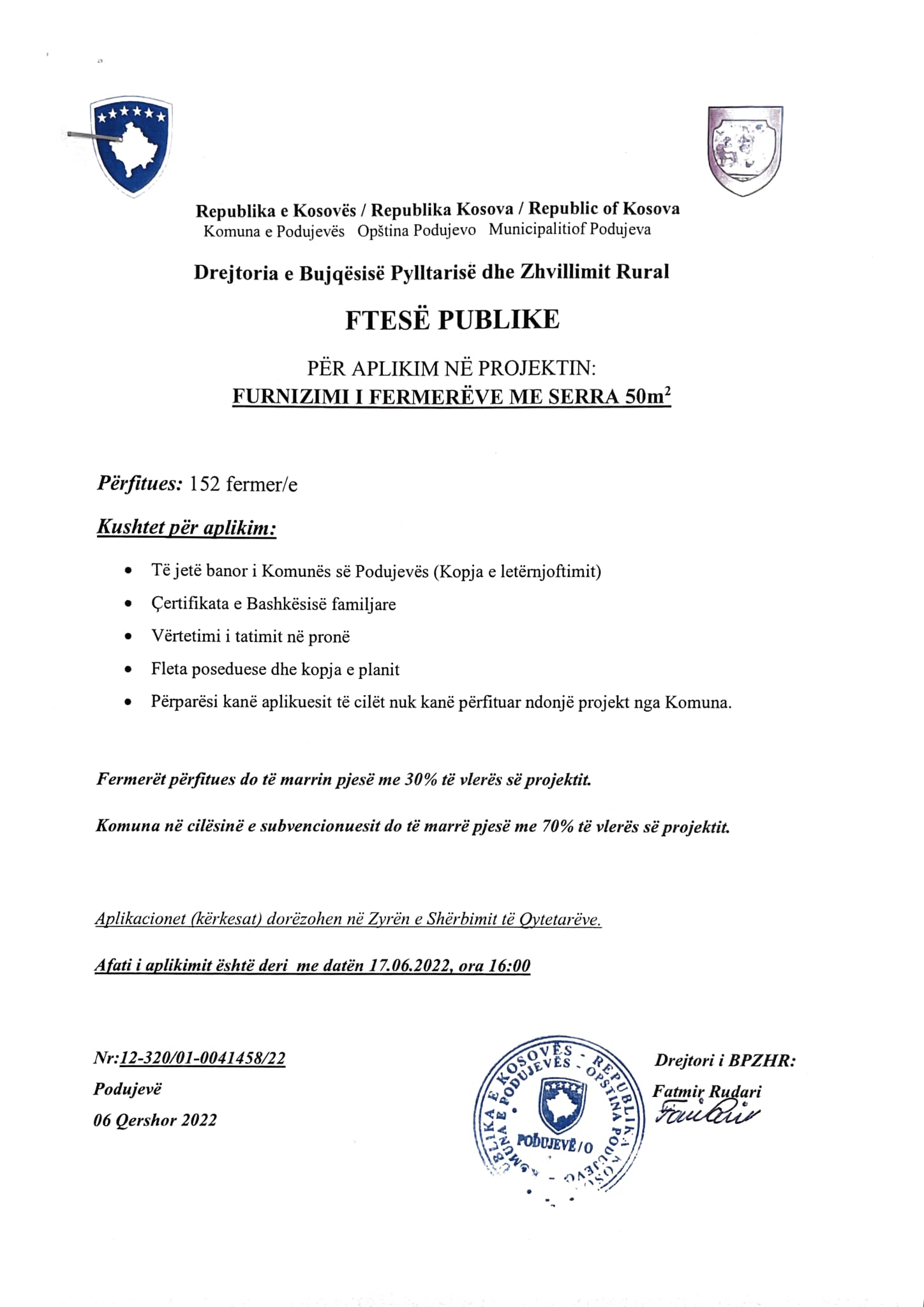 Sipas kësaj ftese të publikuar nga Komuna, përfitues do të jenë 152 fermerë llapjanë.