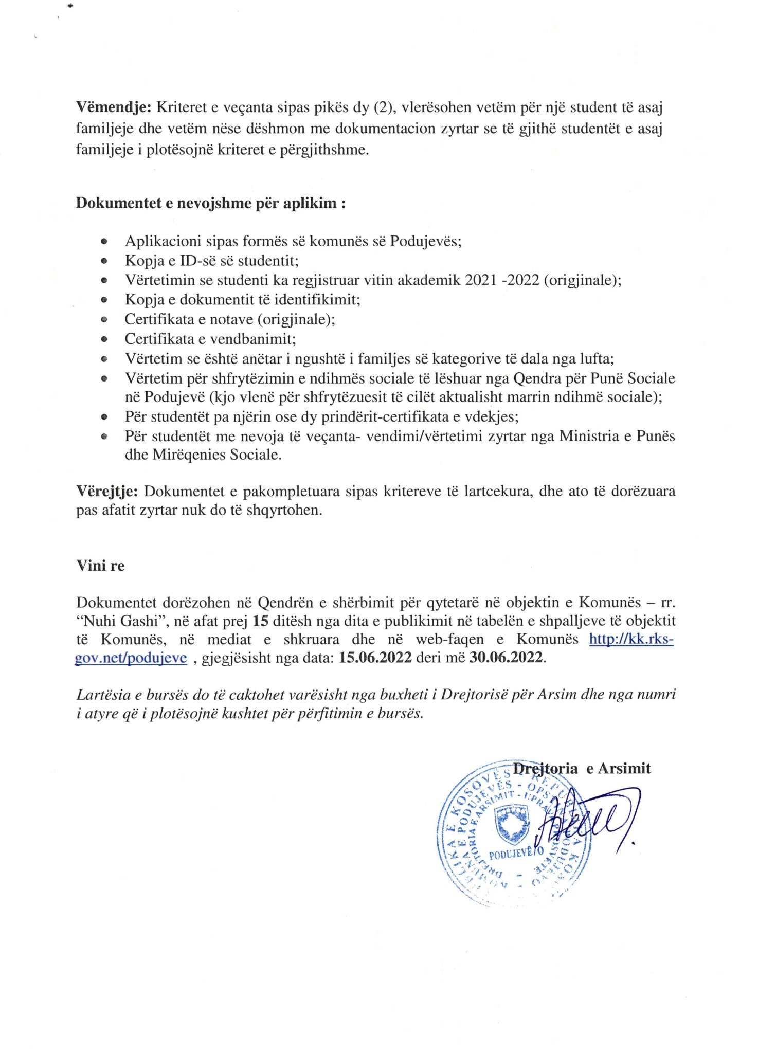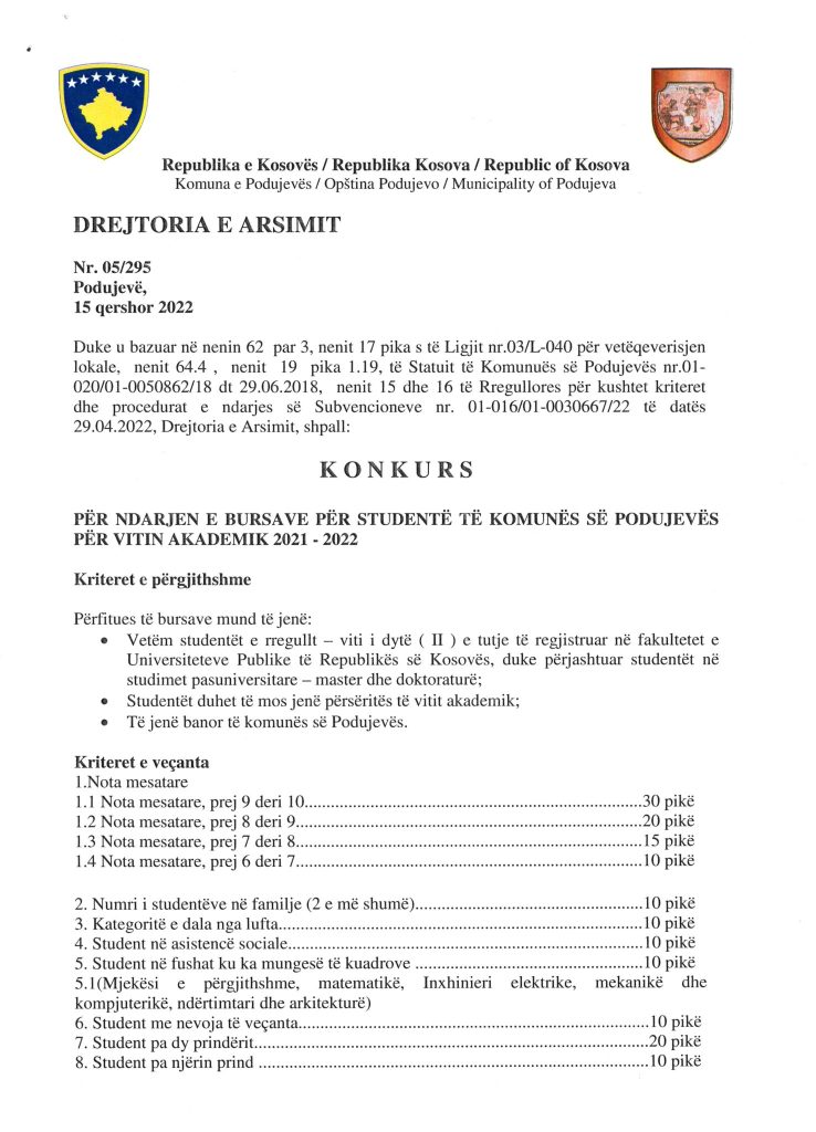Sipas konkursit të lëshuar nga kjo drejtori, përfitues të këtyre bursave do të jenë të gjithë ata studentë që janë banorë të komunës së Podujevës dhe të cilët përmbushin kriteret e përgjithshme.