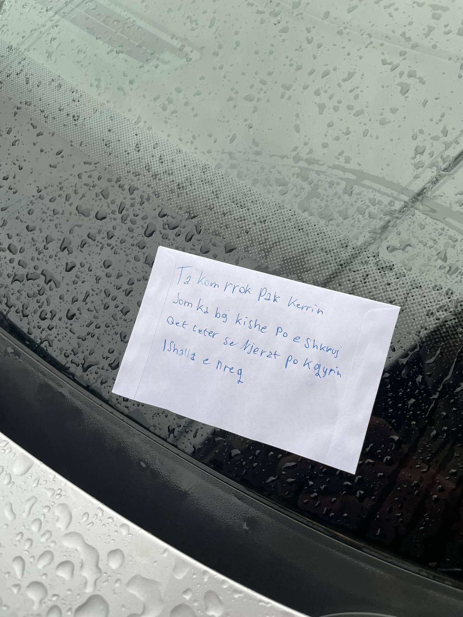 “Ta kom rrok pak kerrin. Jam ka bëj kishe po e shkruaj qet letër se njerëzit po kqyrin. Ishalla e nreq”, thuhet në letrën që ia ka lënë mbi veturë.