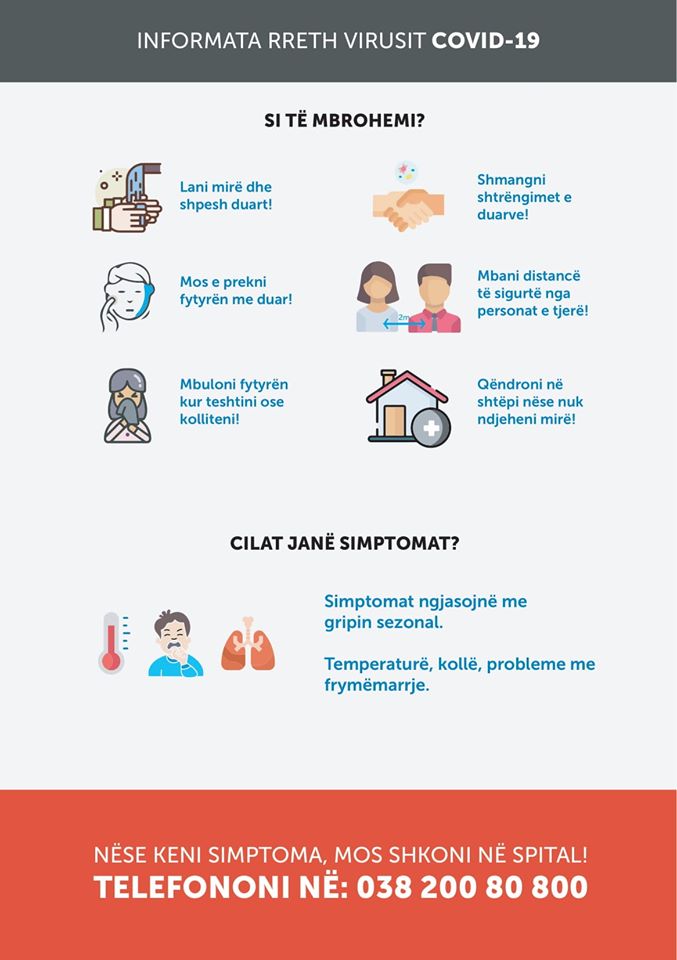 “Pa frikë e me kujdes të shtuar! Nëse keni simptoma, mos shkoni në spital! Telefononi në: 038 200 80 800”.