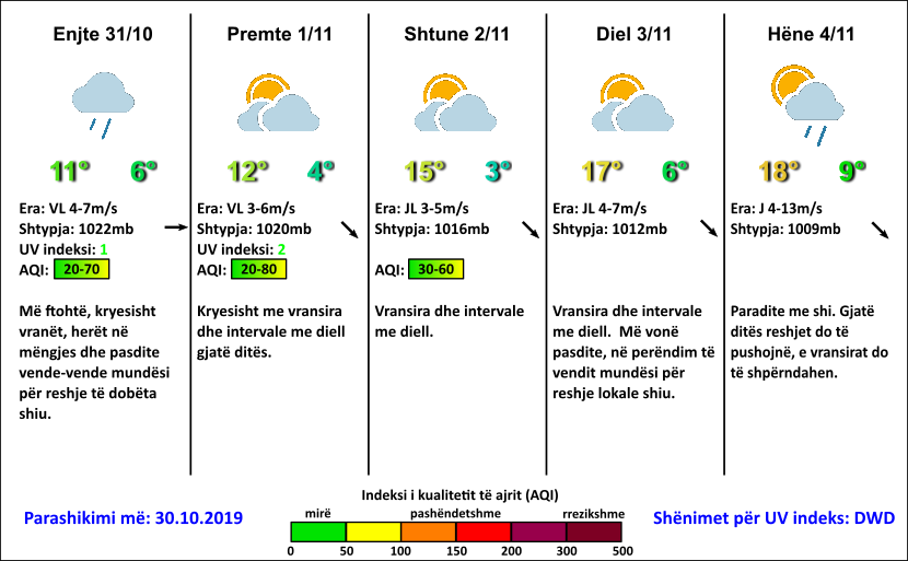 31.10 – Më ftohtë, kryesisht vranët, herët në mëngjes dhe pasdite vende-vende mundësi për reshje të dobëta shiu.