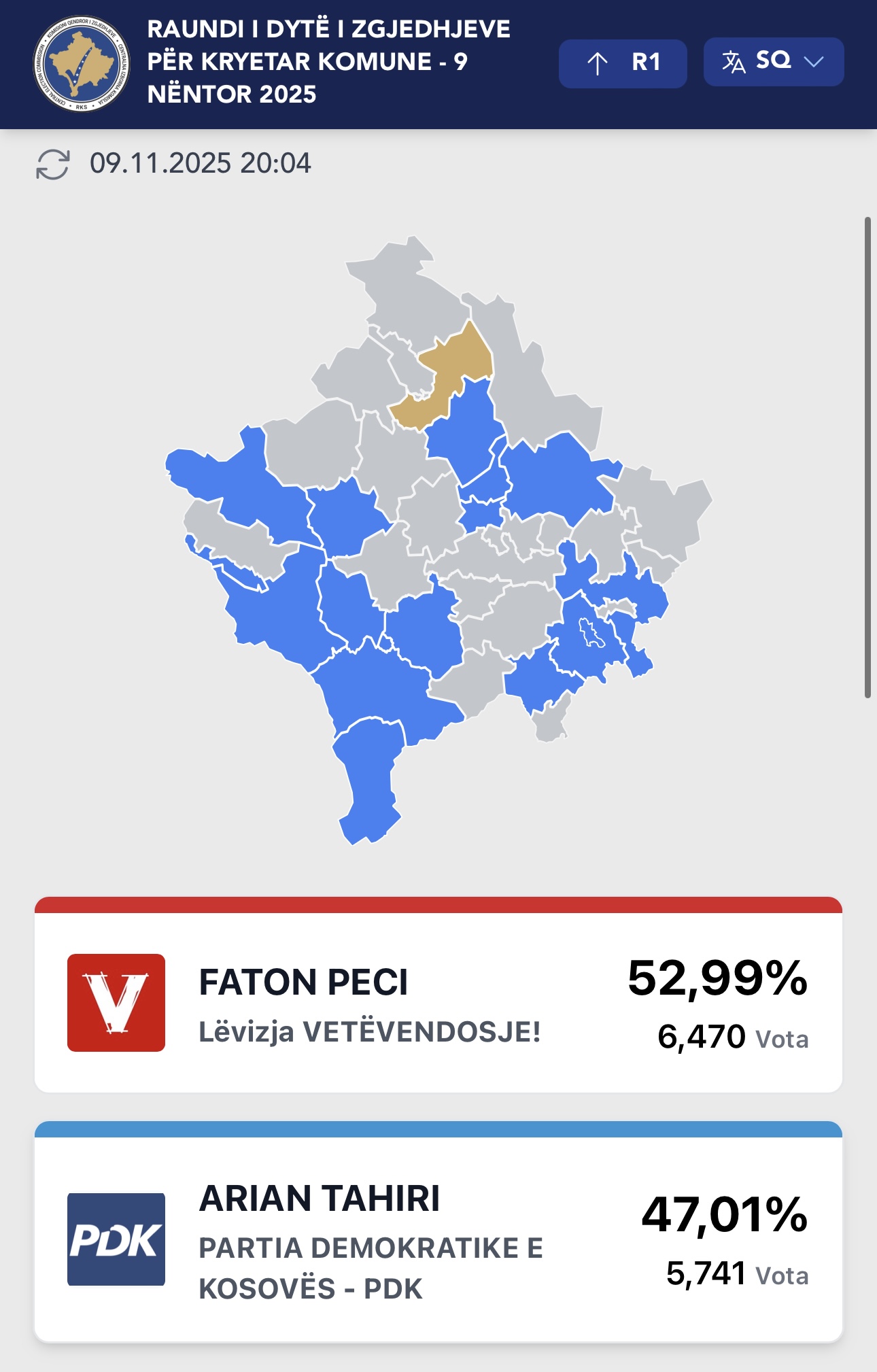 Ballina Lajmet Ky është rezultati momental në Mitrovicë Ky është rezultati momental në Mitrovicë 09/11/2025 Share FacebookTwitterWhatsAppViberEmail Deri më tani janë numëruar 45 kuti në Mitrovicë. Ky është rezultati momental në këtë komunë. Screenshot ARTIKUJ TË NGJASHËMMË SHUMË NGA AUTORI Lajmet Nait Hasani i kërkon Bedri Hamzës ta pranoj shkrirjen e Fatmir Limajt në PDK: Bashkimi bën fuqi Lajmet Një person dhunon të miturën, e incizon dhe e publikon videon Lajmet Ky është personi që humbi jetën në QKUK, ishte i dyshuar për vrasje