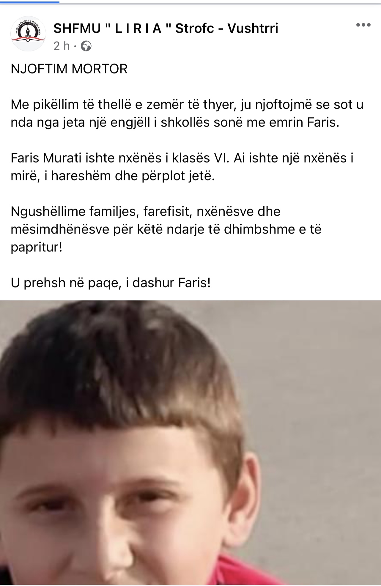 Lajmi i dhimbshëm u bë i ditur nga shkolla SHMF ‘Liria’ Strofc ku nxënësi vijonte mësimet në klasën 6-të.