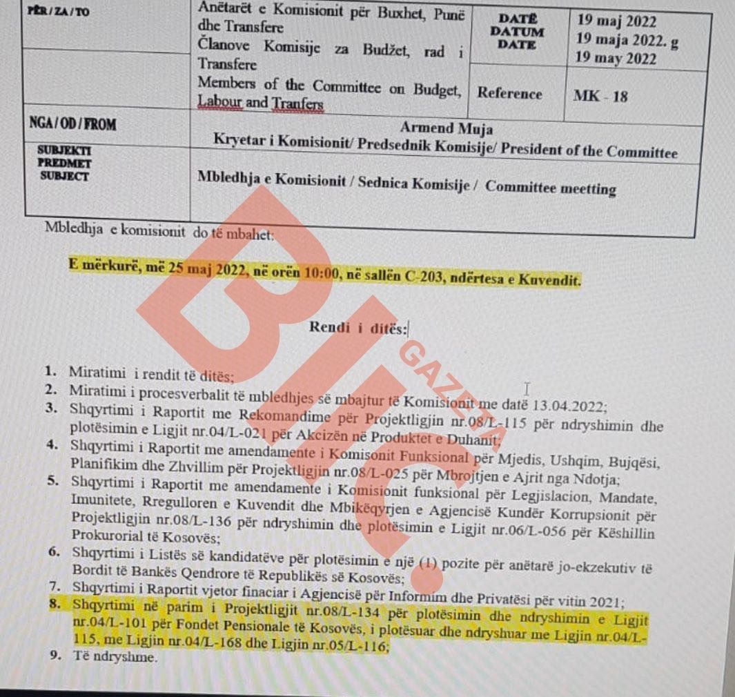 Tërheqja e parave nga Trusti është në rend të ditës, në mbledhjen e Komisionit që do të mbahet të mërkurën, e kryesuar nga Armend Muja.
