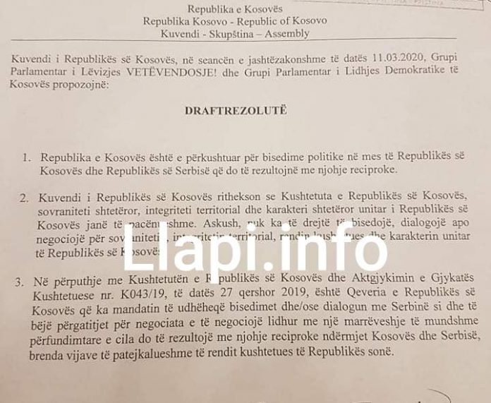 Shefi i Grupit Parlamentar të Lëvizjes Vetëvendosje, Rexhep Selimi, në seancën e jashtëzakonshme të thirrur nga opozita, ka propozuar një draftrezolutë për dialogun, raporton Llapi.info.