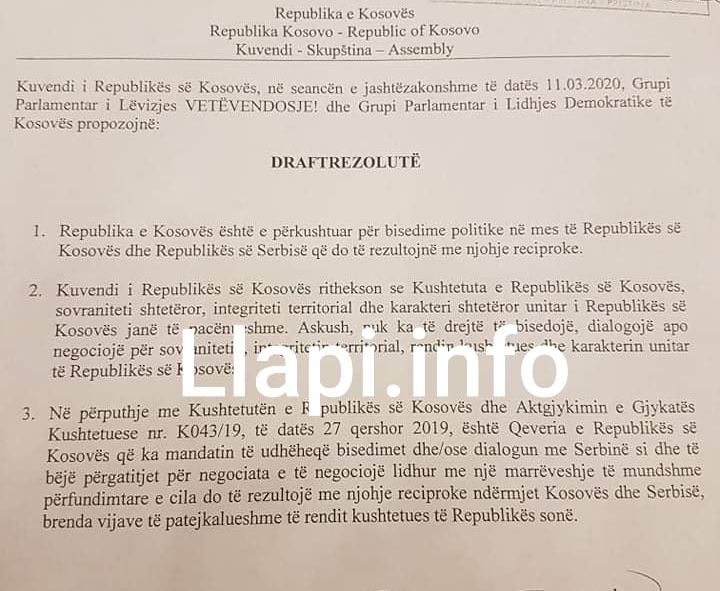 Kuvendi i Republikës së Kosovës rithekson se Kushtetuta e Republikës së Kosovës, sovraniteti shtetëror, integriteti territorial dhe karakteri shtetëror unitar i Republikës së Kosovës janë të pacenueshme. Askush, nuk ka të drejtë të bisedojë, dialogojë apo negociojë për sovranitetin, integritetin territorial, rendin kushtetues dhe karakterin unitar të Republikës së Kosovës.