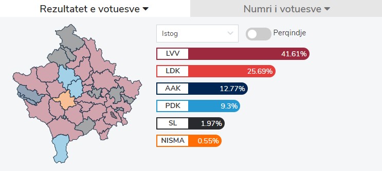 Sipas rezultateve e deritanishme LVV-ja ka marrë 41,61% duke lënë mbrapa LDK-në me 25,69%, AAK-në me 12,77% dhe PDK-në me 9,30%.