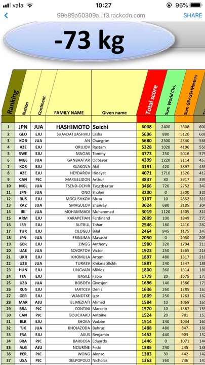 Akil Gjakova renditet në pozitën e shtatë me 4191 pikë në kategorinë e -73 kilogramë.