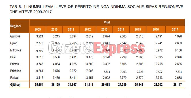 Rreth 106 mijë e 628 qytetarë në vend jetojnë vetëm nga ndihmat sociale. Ndërsa, numri i familjeve që përfituan nga ndihmat sociale për vitin 2017 ishte 26 mijë e 117 familje, shkruan Gazeta Express.